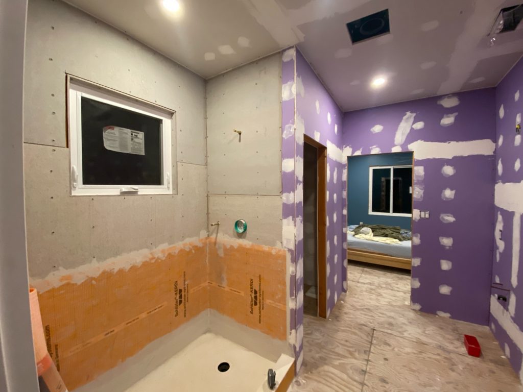 - Primary bedroom-bathroom suite drywalled and shower waterproofing installed